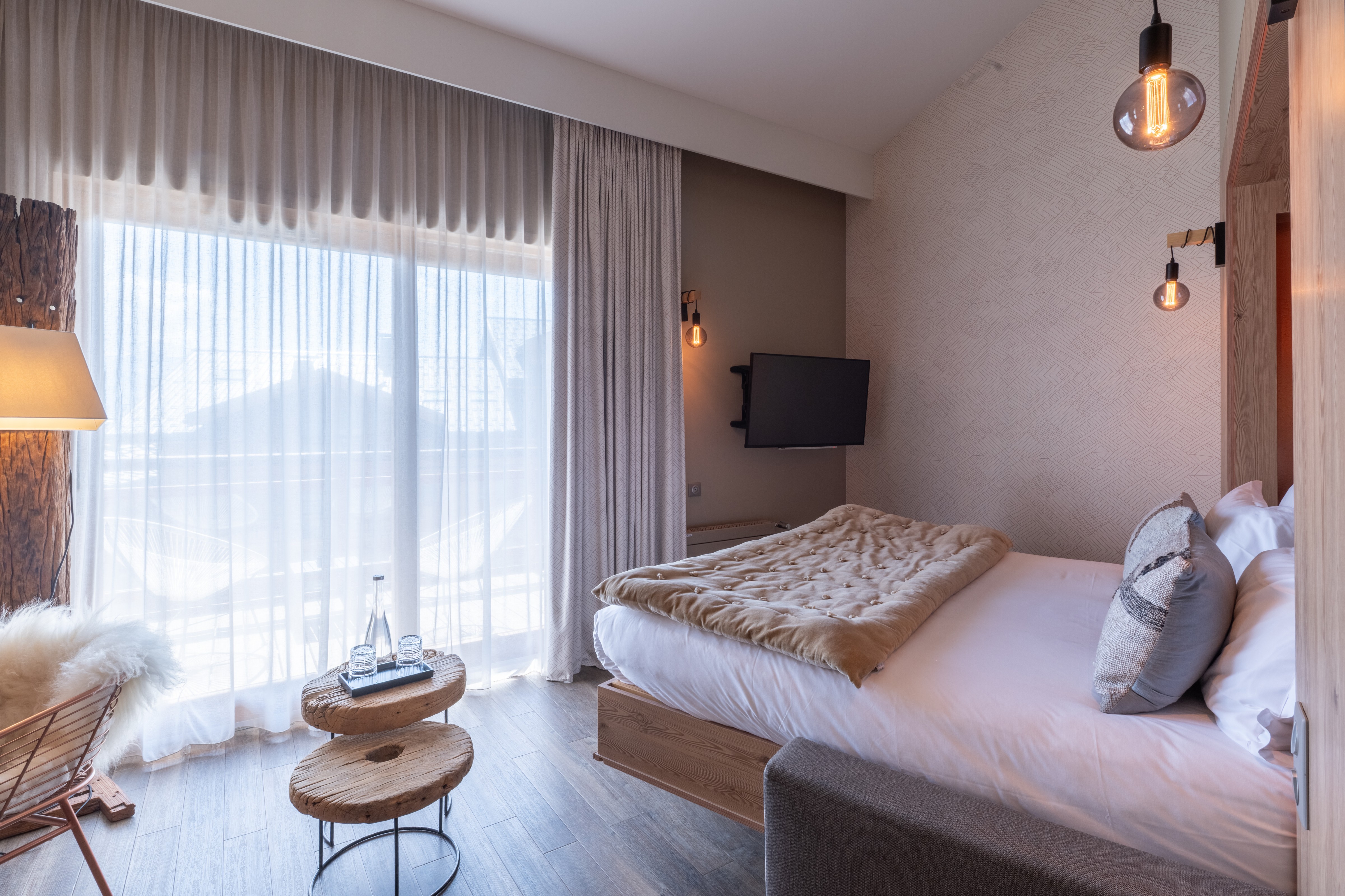 1 double bed or 2 single beds + 1 double bed. Mountain or village views. Bathroom with bath or shower: single washbasin, hairdryer, bathrobes, slippers, toiletries. Free Wi-Fi, connected TV, telephone. Mini-bar. Safe. Maximum 2 people.